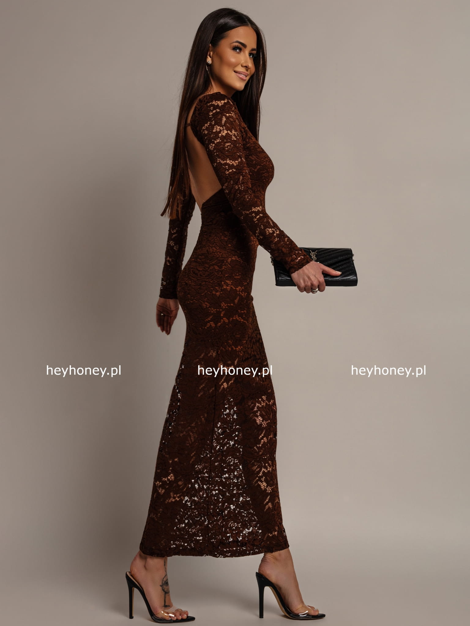 Chocolate ENDLESS Open Back Lace Maxi Dress